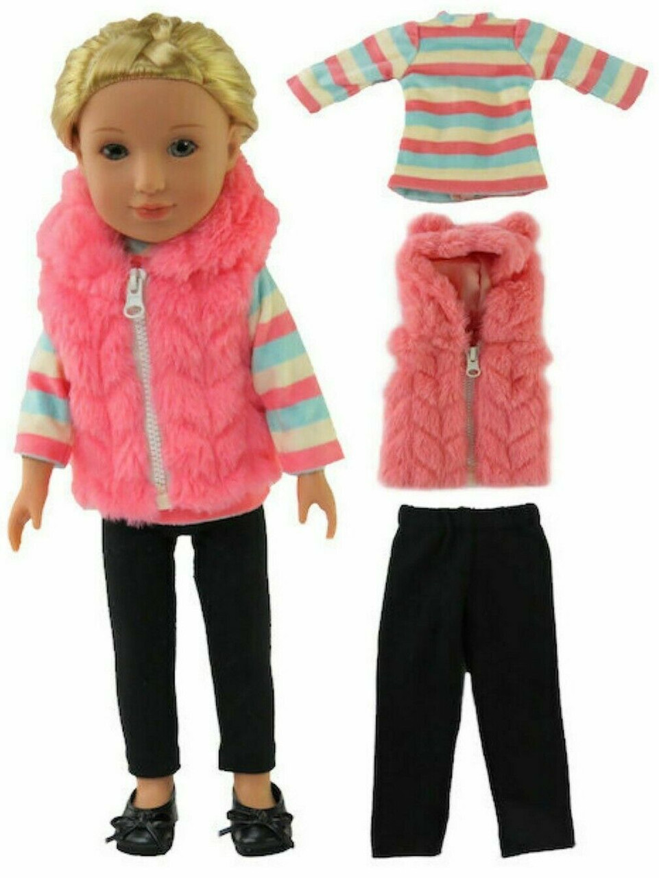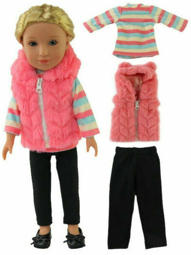 - Fluffy Hooded Vest, Striped Top, & Black Leggings for Wellie Wishers Dolls