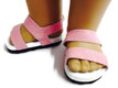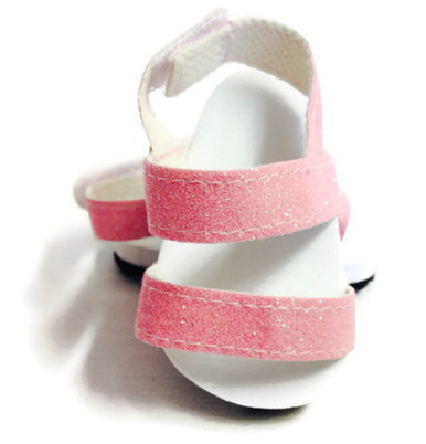 Sparkly pink glitter sandals with Velcro closure. These are 2 3/4 inches long, 1 inch wide at the heel, and 1 1/2 inches wide at the widest part of the toes.